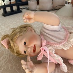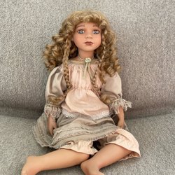 En söt docka med blå ögon och blont lockigt hår. Hon har en rosa klänning med spetsdetaljer och en matchande hatt. Perfekt för samlare eller som en dekorativ detalj. Obs det finns limfläck på baksidan och två små svarta pickar på mössan se bilder.