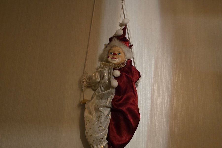 Clownfigur klädd i en dräkt som är hälften vit med guldmönster och hälften röd. Clownen har en vit krage med spetsdetaljer och en matchande hatt med vita pom-poms. Ansiktet är målat med röda kinder och läppar samt blå ögon. Clownen sitter på en liten trägunga som är upphängd med snören.