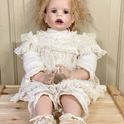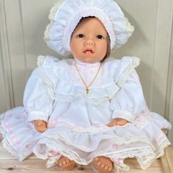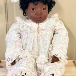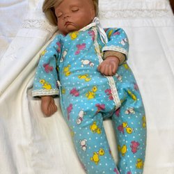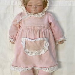 Söt traditionell porslinsdocka, 40 cm. Handsydda kläder ca 80/90-tals tyg. Mkt fint skick.