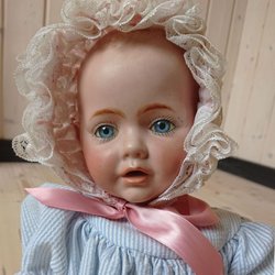 Porslinsdocka klädd i en vit och blommig klänning med matchande hätta. Dockan har blont hår stylat i flätor. En liten rottingstol ingår.