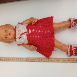 En charmig vintage docka med tillhörande kläder och skor. Inkluderar en glittrig klänning, en orange jacka med tryck, en vit jacka med tillhörande byxor och ett par vita skor. Perfekt för samlare eller som en nostalgisk leksak.