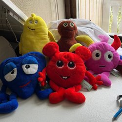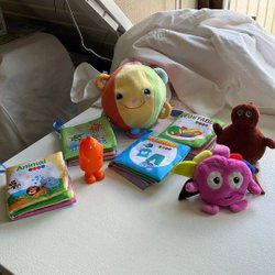 En söt 40 cm Cabbage Patch Kids docka med blont hår i tofsar och blå ögon. Hon har en blå klänning med blommor och vit spets. Skor och strumpor. Mycket fint skick