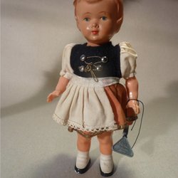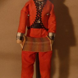 En charmig gammal docka med distinkt stil. Dockan har en svart huvud, stora ögon och en röd fluga. Den bär en orange jacka över en väst med knappar, rutiga byxor och matchande skor. Perfekt för samlare eller som en unik inredningsdetalj.