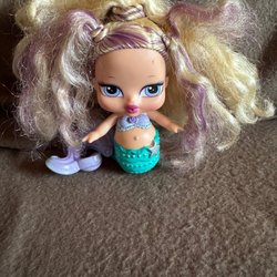En söt docka klädd i traditionell svensk folkdräkt. Dockan har blont hår och blå ögon. Dräkten består av en vit blus, en blå och gul kjol med blomdetaljer och en vit hätta. En blå rosett knyts baktill.