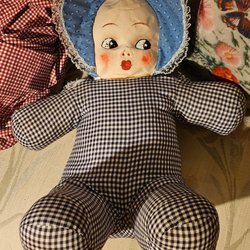 A cute little vinyl doll from the 60s-70s, has movable head, arms and legs, and can be bathed. The doll is 16 - 17 cm tall. Dressed in charming old-fashioned clothes reminiscent of childhood - a real nostalgic treasure.