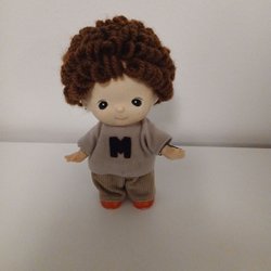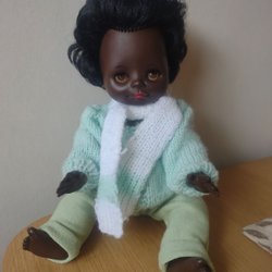 En söt docka med långt brunt hår. Ansikte, underarmar och underben i någon slags keramik. Fin vinröd sammetsklänning med matchande hårband samt en extra marinblå sjömansdress (veckad kjol och blus). Vita strumpor och rosa skor.