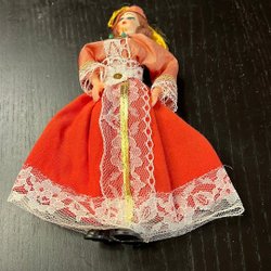 En charmig vintage docka med brunt hår och en unik klädstil. Perfekt för samlare eller som en nostalgisk leksak.