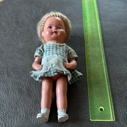 En söt vintage bebisdocka från 1988. Dockan har en randig sparkdräkt med djurmotiv.