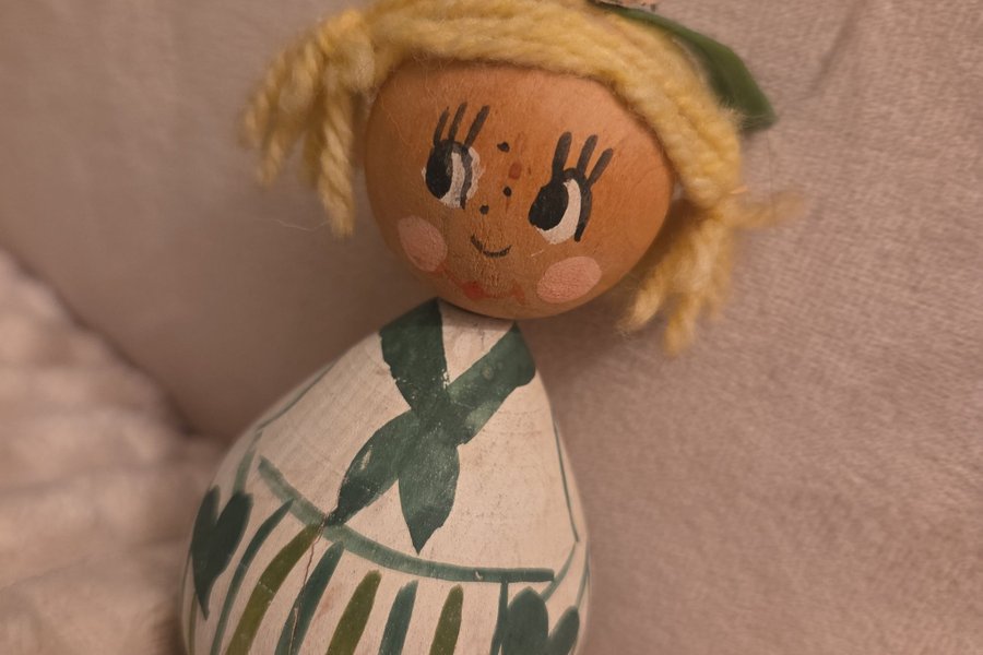 Trädocka med målat ansikte och gult garnhår. Dockan har en grön blomma i håret och en vit kropp med gröna ränder och hjärtan.