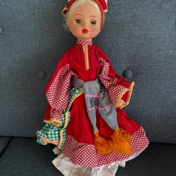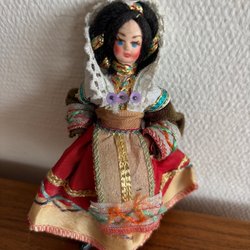 Docka klädd i folkdräkt med mörkt hår uppsatt i två tofsar med gula rosetter. Dockan bär en vit lurvig jacka med röda kanter och gröna och röda snören knutna framtill. Hon har röda byxor och vita lurviga skor med gröna och röda snören lindade runt anklarna. På baksidan av byxorna är det små hål, se bilder.