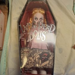 Denna docka har blont hår och bär en grön klänning med en vit spetskrage. Klänningen är gjord av sammetstyg och har en rosa rosett framtill. Dockan har en unik ansiktsuttryck med öppen mun och utstickande tunga.