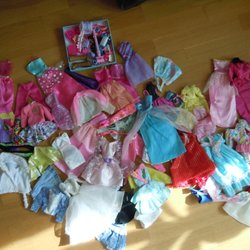 Ett stort sortiment av Barbie kläder och tillbehör. Inkluderar klänningar, kjolar, toppar, byxor, skor, smycken bl.a.