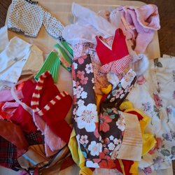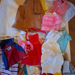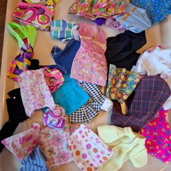 Ett stort sortiment av Barbie kläder i olika färger och stilar. En del kan behövas lagas och tvättas