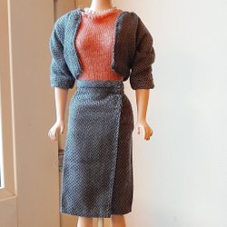 Du bjuder på en handsydd klänning till Barbie efter ett äldre mönster från 1960-talet. Klänningrn är av "Barbie Q" snitt, här i ett lite 'vippigare' tyg med fastsydd underkjol i tyll.