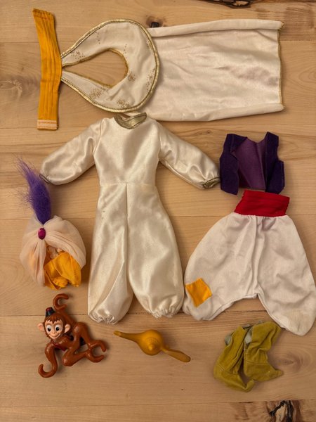 Disney Mattel Aladdin 1992 originalkläder med tillbehör tillhörande Aladdin. Prinskläder, stövlar, cityoutfit, apan Abu och lampan. Fint skick!