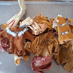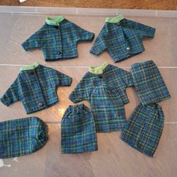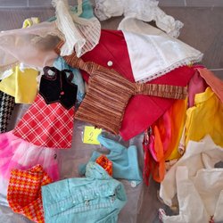 Ett sortiment av dockkläder i olika stilar och färger. Innehåller klänningar, toppar, byxor.