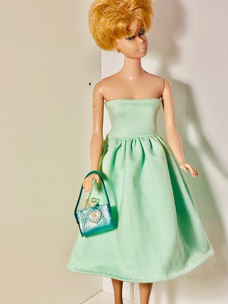 mintgrön fin vardagsklänning passar Barbie och dockor i liknande storlek, väskan i äkta skinn kommer i en annan auktion, dockan ingår ej