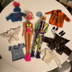 Äldre barbiedock-kläder till Barbie och Ken. I fint använt skick, se bilder. Den blåa jackan har ingen lapp på sig, övriga se bilder.