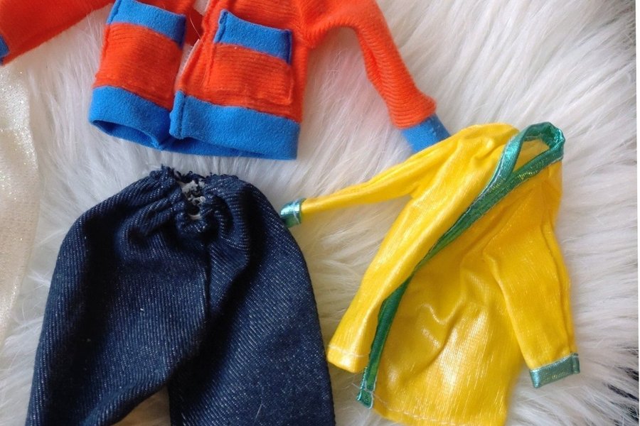 Set med tre plagg till Sindy. Innehåller två jackor,och ett par byxor. Se gärna mina andra försäljningar också Barbie och sindy kläder mm