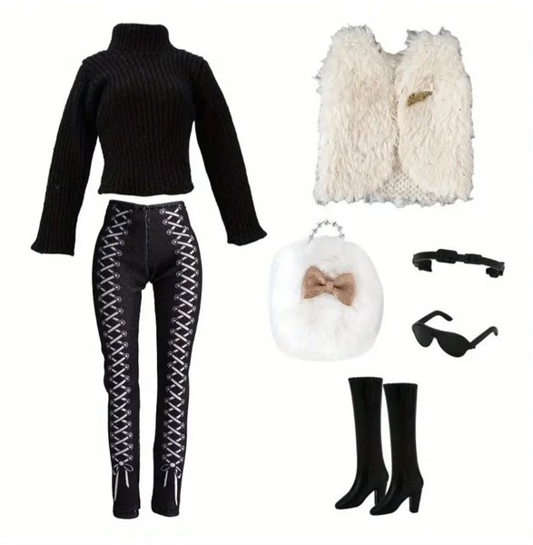 Ett komplett set med dockkläder. Inkluderar en svart tröja, byxor med snörning, en vit väst, en väska, ett par solglasögon, ett halsband och ett par stövlar.