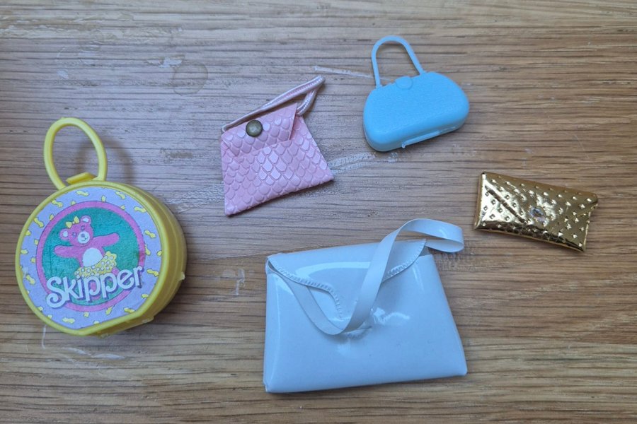 Detta set innehåller fem olika väskor. En gul rund väska med Skipper-logotyp, en rosa väska, en ljusblå handväska, en guldfärgad kuvertväska och en vit axelremsväska. Jag vet inte till vilka dockor eller outfits de tillhör men det kanske är någon som saknar till sin samling.