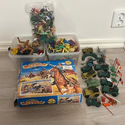 Leksaksfigurer i hårdplast föreställande indianer, träd, eldstad och totempåle. Vissa figurer är märkta med "Hong Kong" , vissa "Britains LTD 1972 MADE IN ENGLAND", vissa omärkt. Flera som saknar bottenplatta och tillbehör. Höjd ca 5-6 cm.