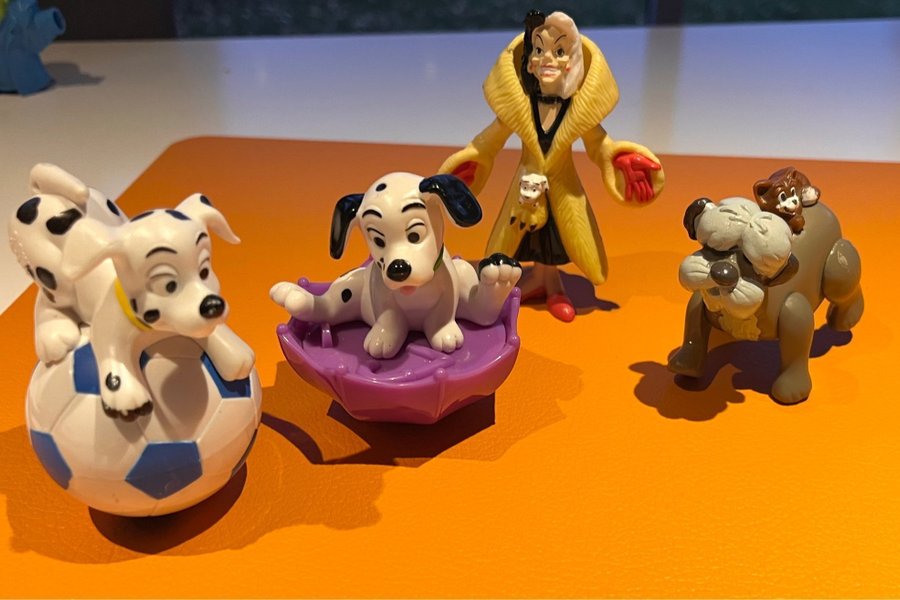 Ur serien 101 Dalmatiner. Cruella de Vil med hundar. Mitten av 90-talet. Väger opackat 350 g, tunga hundar.