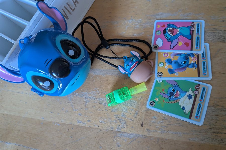 Leksaker med Stitch tema. Inkluderar en Stitch väska, en figur, en visselpipa och tre kort.