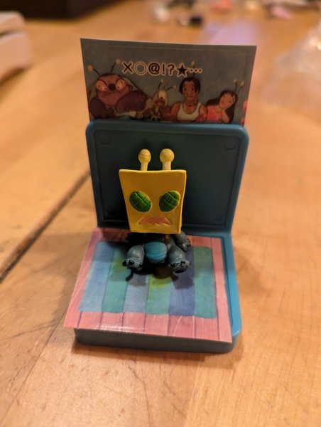 Figur föreställande en karaktär från Disneyfilmen Lilo & Stitch. Den har en gul huvudform och står på en blå bas med ett färgglatt mönster.