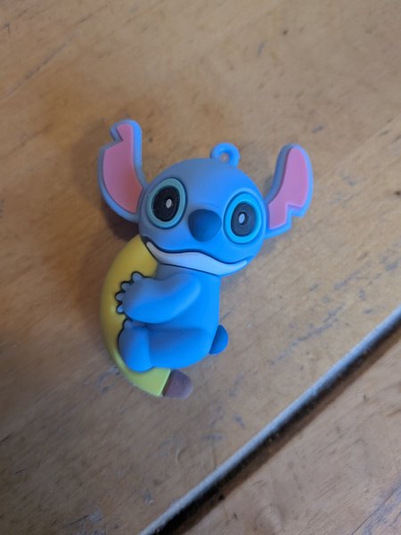 Nyckelring föreställande Stitch från Lilo & Stitch, hållandes i en banan. Tillverkad i gummi.