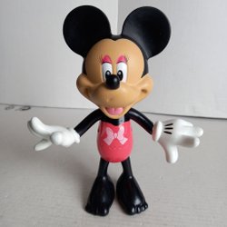 Minnie Pigg figur i röd klänning med vita prickar och gula skor. Figuren är märkt med "© Disney Made in China" under ena foten.