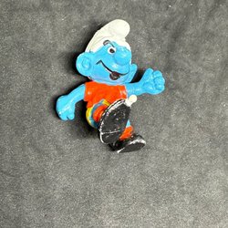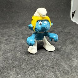 En smurf figur som föreställer en målare. Den har en färgpalett och penslar. Figuren är tillverkad i plast.