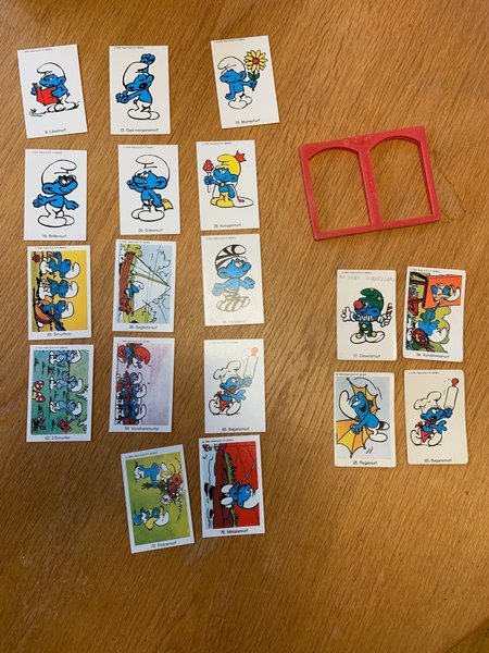 Samling av Smurfkort från 1979. Inkluderar kortnummer 6, 12, 13, 17, 19, 20, 25, 26, 33, 39, 46, 52, 59, 65, 72, 78, 98 och 11. En röd plastram ingår också.