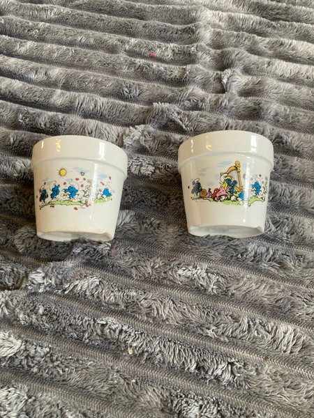 Två vita krukor med smurfmönster. En kruka har smurfar som plockar blommor under solen. Den andra krukan har smurfar som spelar harpa och plockar blommor.ca 8 cm