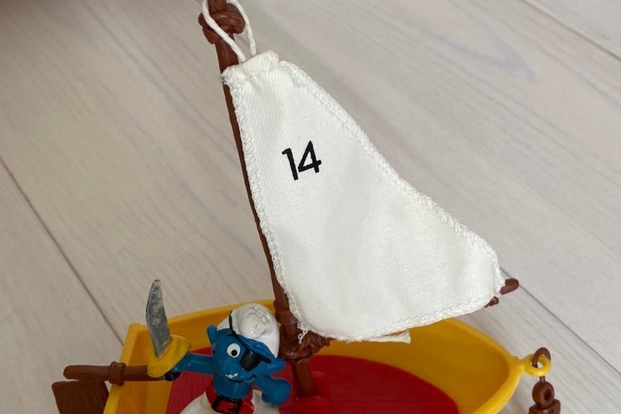 Smurf båt med segel och ankare. En Smurf piratfigur med ögonlapp och svärd medföljer.
