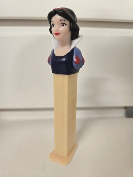Pez dispenser föreställande Snövit från Disney. Den har en vit krage, blå överdel med röda puffärmar och svart hår med ett rött hårband. Basen är beige. Obs! Annat fraktsätt är EJ spårbart.