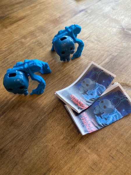 Säljer två blå Demogorgon figurer från Stranger Things, tillsammans med tillhörande bilder.