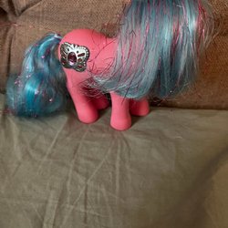 Två troll dockor. En rosa hårig troll docka med en kjol och en silverfärgad topp. Den andra troll dockan har pirat tema med en röd och vit randig tröja och svarta byxor.