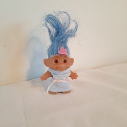 En söt Dam troll docka med gulfärgat hår och kläder. Märkt DAM 2005 på foten. Tillverkad i Kina.