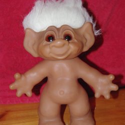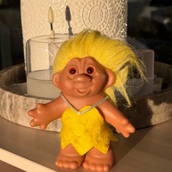 Söt Dam Troll docka från 1986. Denna docka har orange hår, en blommig skjorta och gröna byxor. Märkt med "DAM 1986" och "Made in China" på fötterna. Cirka 18 cm hög.