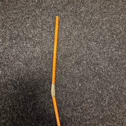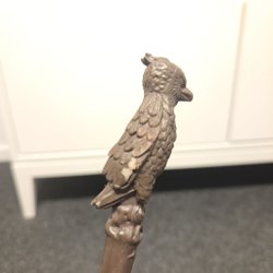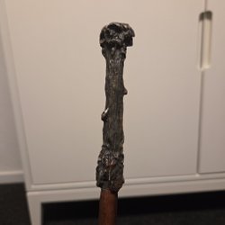 Trollstav med en riddare som handtag. Staven är brun med ett mönster som liknar fjäll eller löv. Riddaren håller ett svärd framför sig. Skicket är bra, förutom toppen av riddarens hatt, se bild.