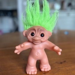 Troll docka med svart hår. Dockan har gröna ögon och en blå klänning. På ryggen står det ”ORIGINAL - DAM”.