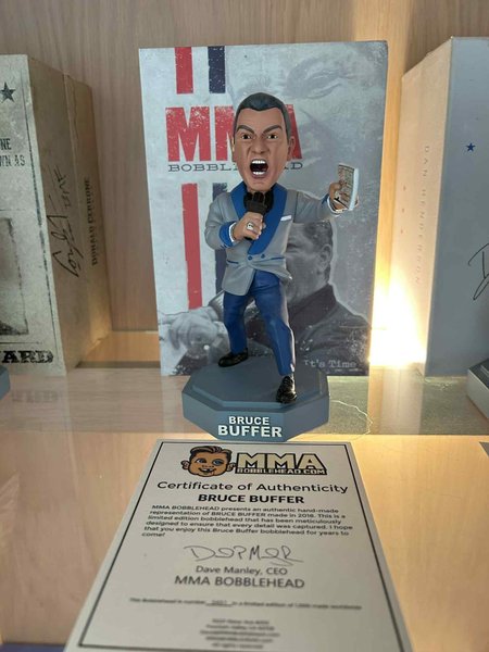 Bruce Buffer bobblehead från MMA Bobblehead. Denna bobblehead är en autentisk handgjord representation av Bruce Buffer, tillverkad 2018. Det är en limited edition bobblehead som är slutsåld hos MMAbobblehead i USA.