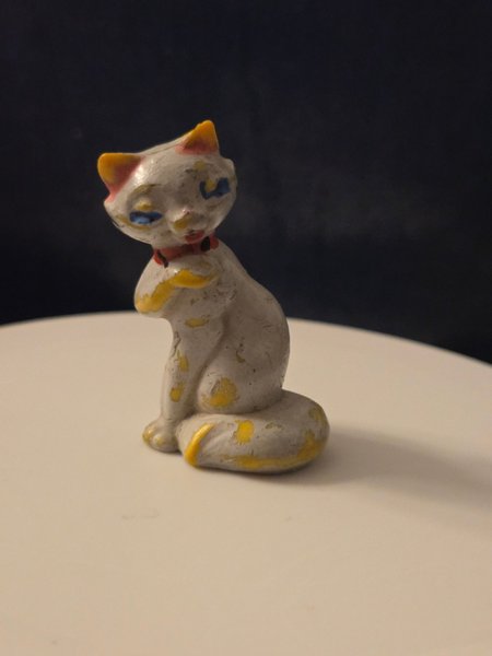 En kattfigur i keramik. Figuren är vit med gula, rosa och blå detaljer. Den har en röd halsband.