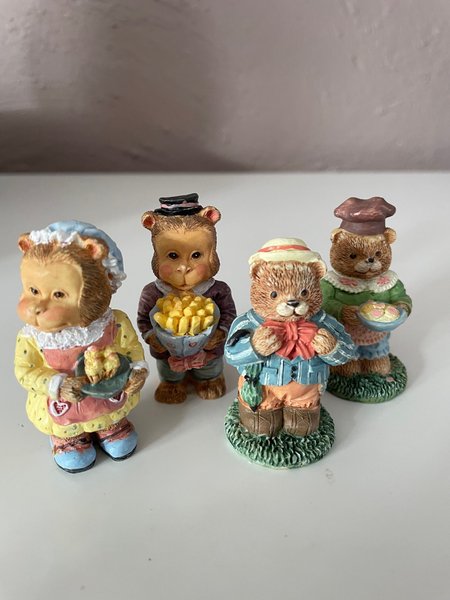 Set med fyra björnfigurer. Figurerna är detaljerade och föreställer björnar i olika kläder och med olika föremål, som en korg med pommes frites, en skål med bakverk och ett paraply. Varje figur står på en grön bas som liknar gräs.