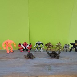 Ett set med actionfigurer i olika färger och former.