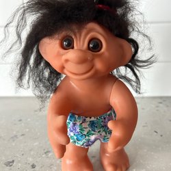 LYCKOTROLL made in Denmark 1977. Är ca 22 cm hög. Kläderna hemsydda.