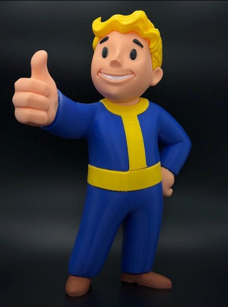 Vault Boy figur från Fallout. Figuren är blå och gul med bruna skor. Den föreställer Vault Boy som ger tummen upp.