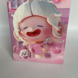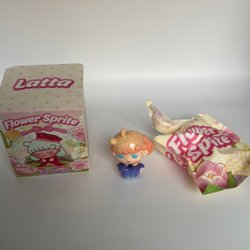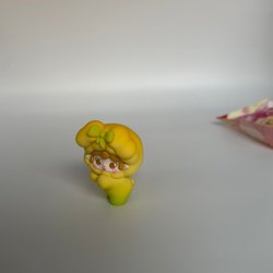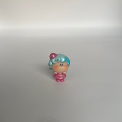 Mido figur med en söt kattmössa. Figuren har blont hår och en rosa klänning med vita prickar. Den sitter ner och har en liten blå katt på huvudet. Under figuren finns ett nummer "100492".