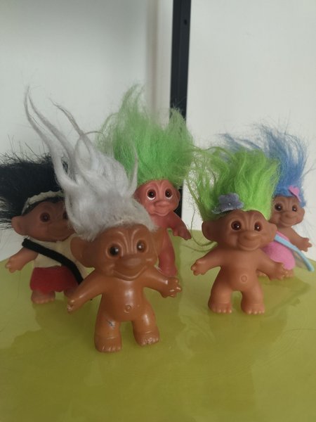 Detta är en samling av 5 troll dockor. De har olika hårfärger: svart, vitt, ljusgrönt och blått. En av dockorna har en röd kjol och en vit topp. En annan docka har en rosa klänning. En docka har en grå hatt.